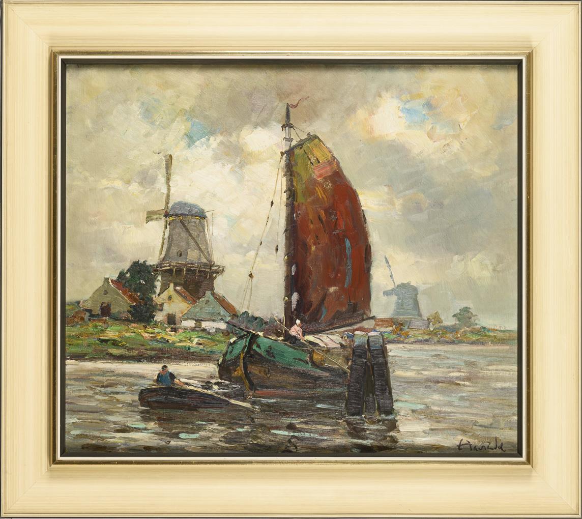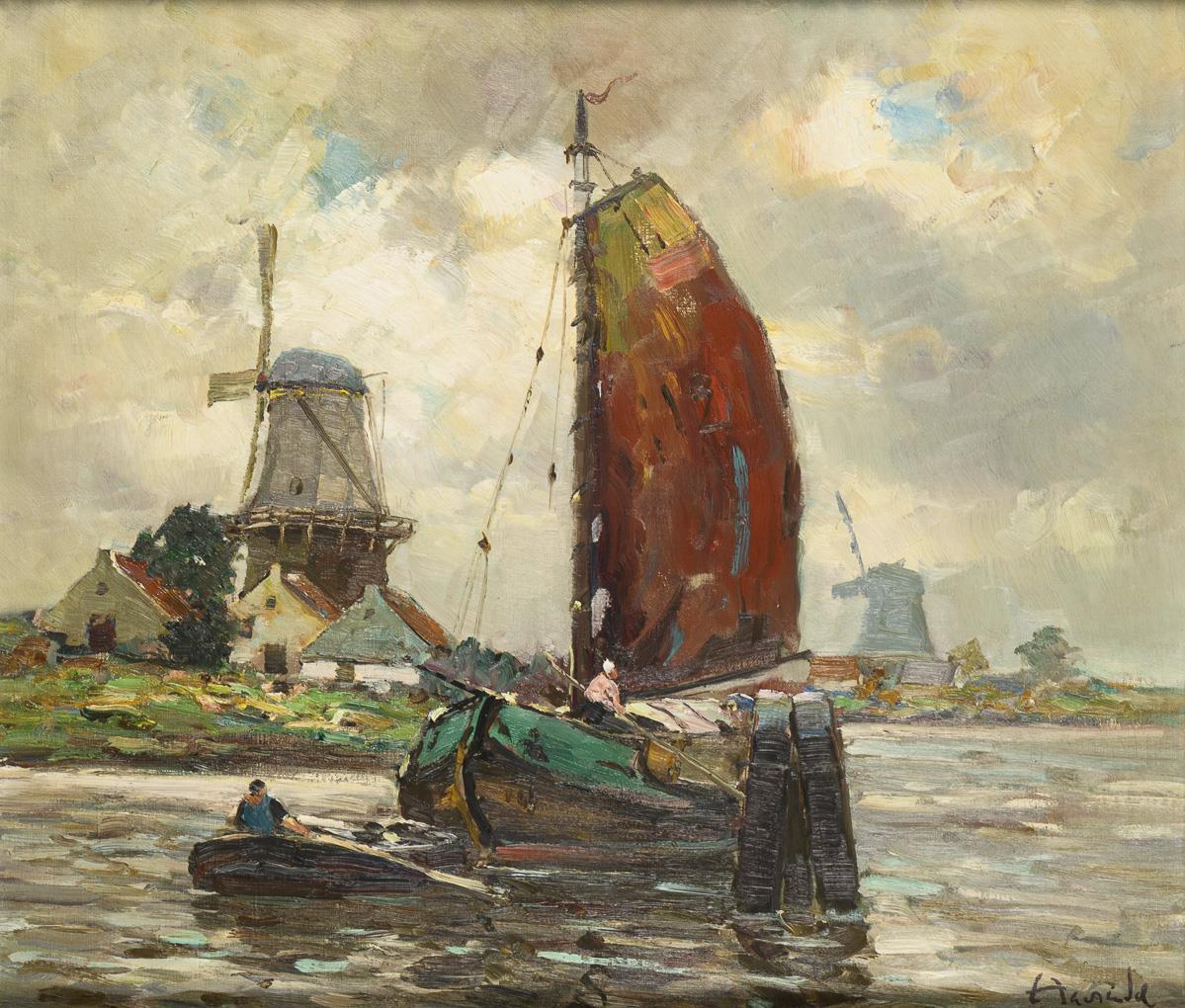Die Fischer nahe dem Ufer mit der Windmühle unter bedecktem Himmel.
