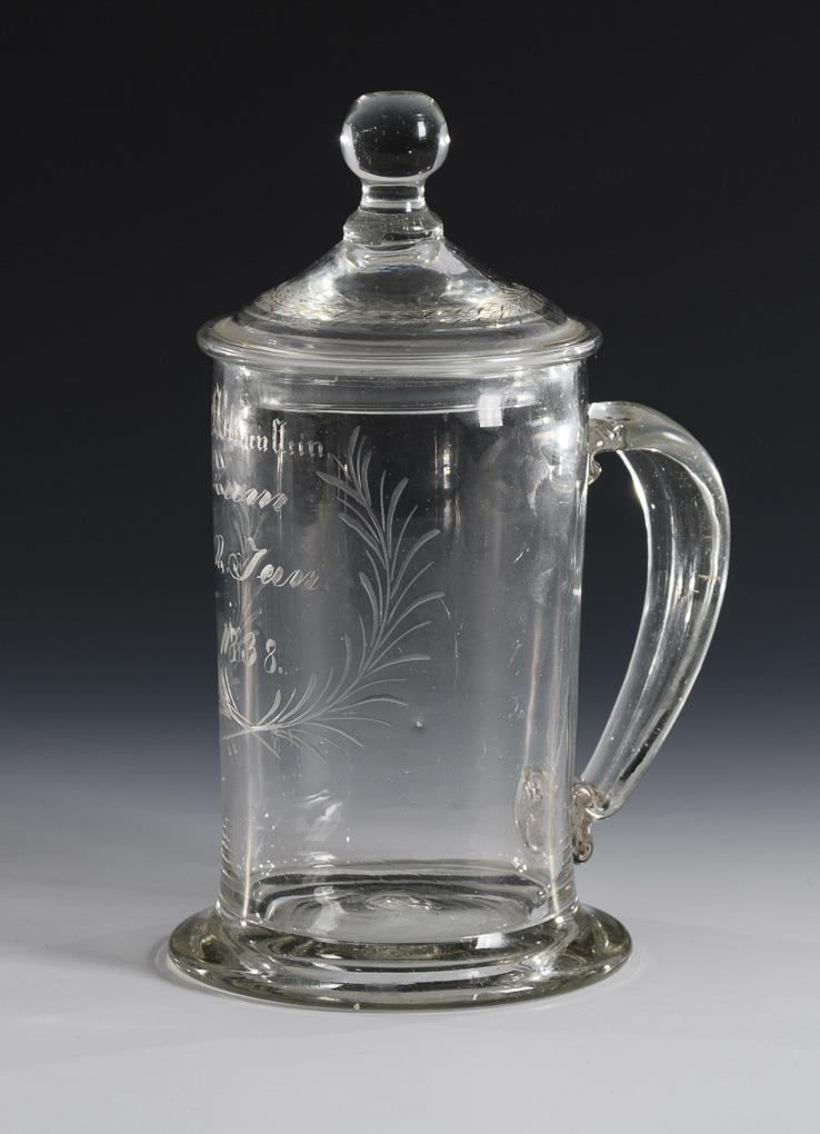 Zylinderkrug mit Bandhenkel und originalem Knaufdeckel; Abriss. Schauseitig die gravierte Widmung "C. Blümenstein. zum 22. Jun. 1838".