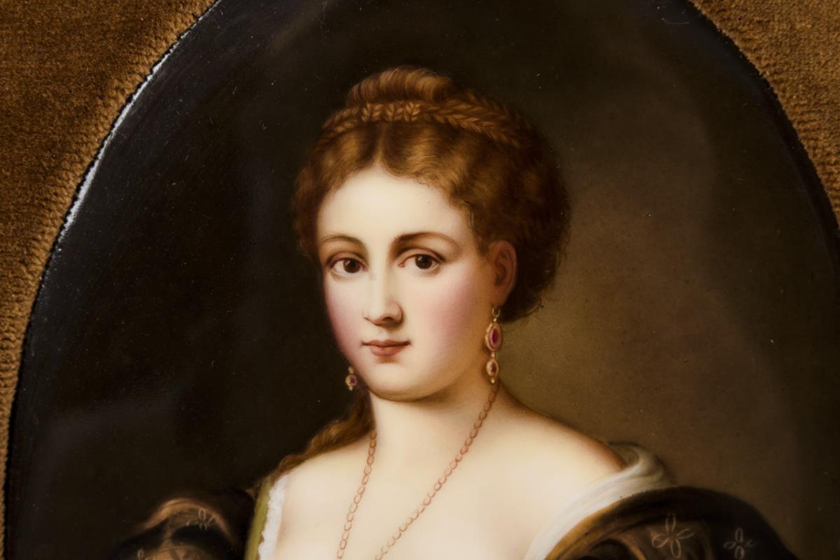 Ovale Platte mit dem Porträt einer jungen Frau in Renaissancekleidung, nach einem Gemälde von Tizian (wohl um 1488/90 - 1576) im Palazzo Pitti in Florenz.