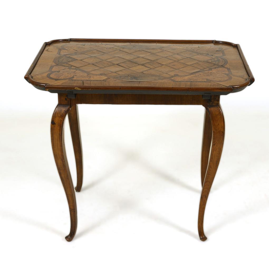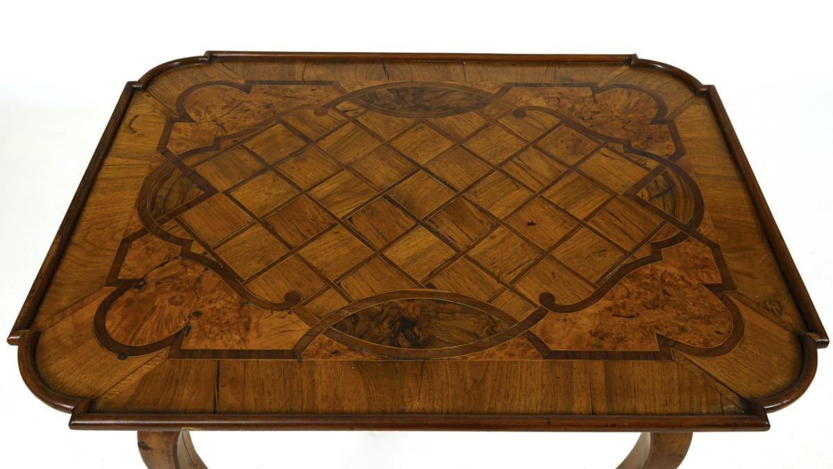 Kleiner rechteckiger Teetisch mit geschweiften Ecken, auf 4 leicht geschwungenen Beinen, Tischplatte verziert mit Rautenintarsien, Bandelwerk und Maserfurnier. Alters-/Gebrauchsspuren, Tischplatte wellig, Trockenrisse.