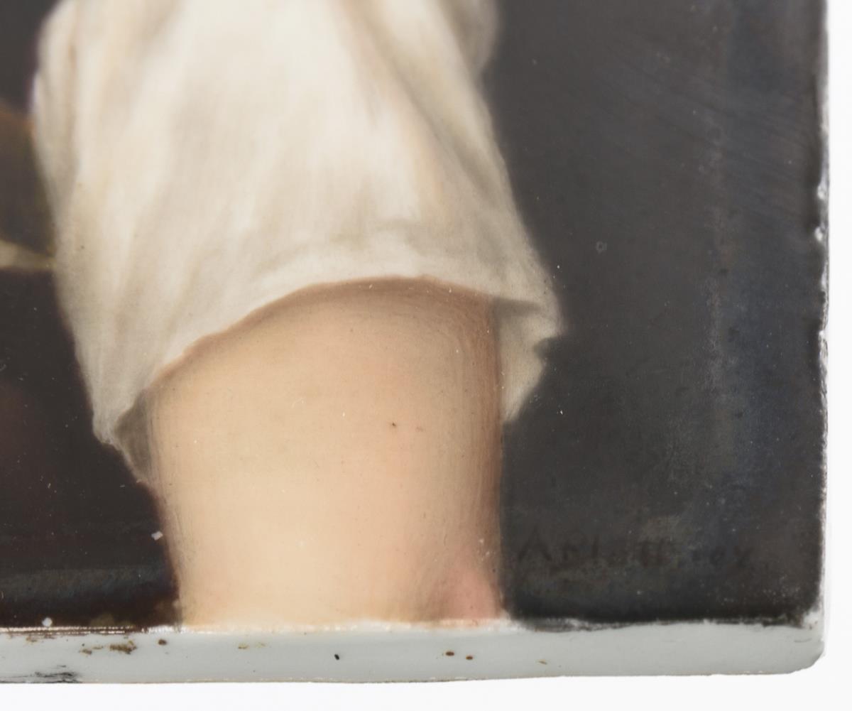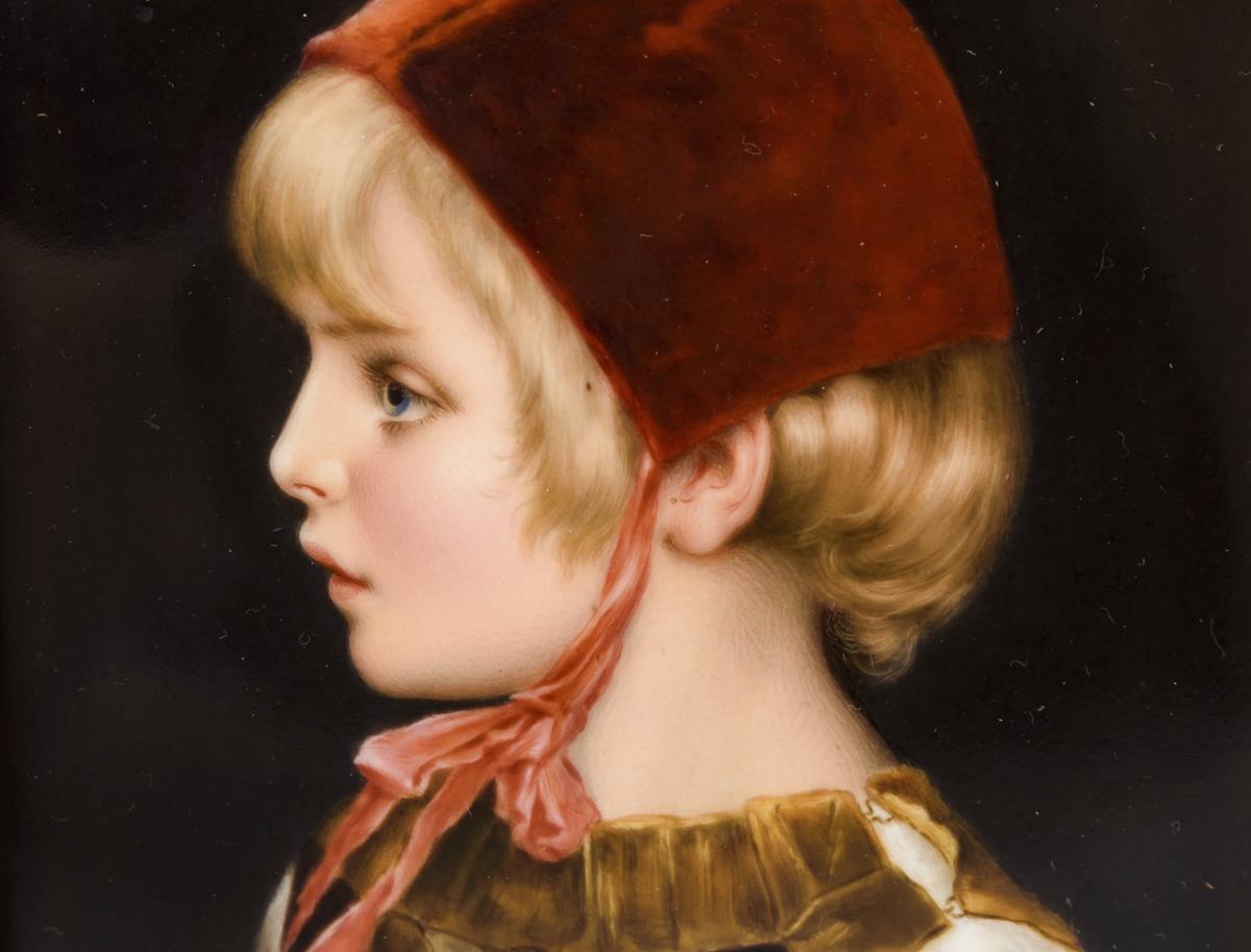 Rechteckige Platte mit dem Porträt eines kleinen Mädchens mit roter Samtkappe, nach einem Gemälde von Gabriel Schachinger (1850-1912).