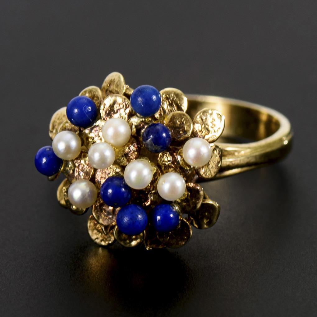 Plastischer Ringkopf, besetzt mit 7 kleinen Lapiskugeln und 7 Zuchtperlchen. Mittlere Schiene.
