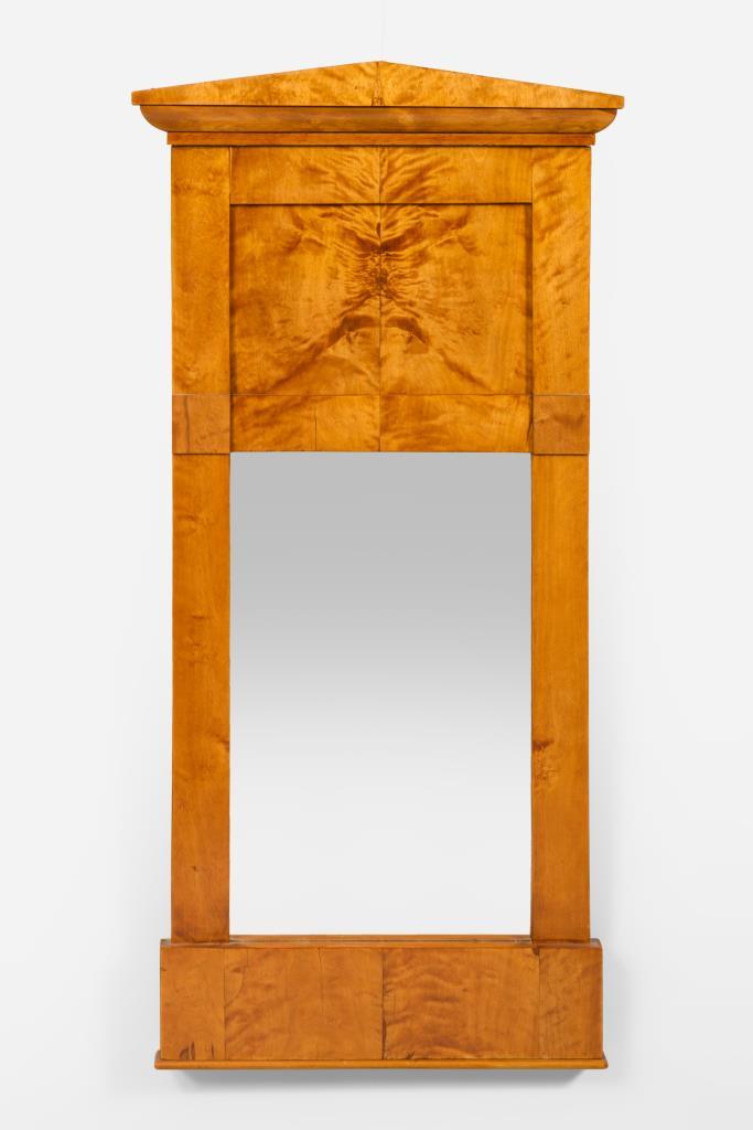 Rechteckiger Wandspiegel mit hohem, spiegelfurniertem Gebälk und Dreiecksgiebel, Rückseite mit Kordel zur Aufhängung. Restauriert, Spiegelglas ergänzt.