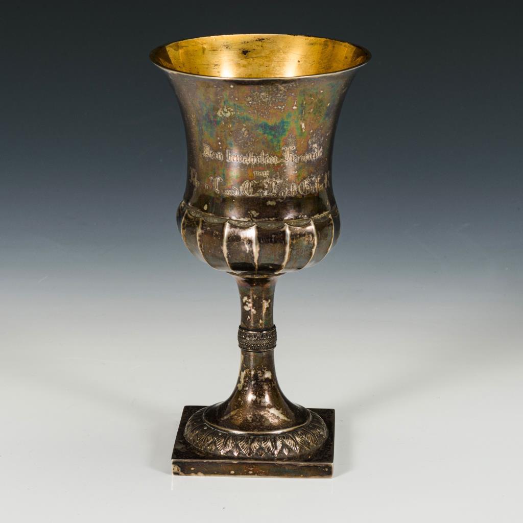 Kleiner Pokal mit Widmungsgravur: "Dem bewährten Freunde Frhr v. I und C v. I, geb. Grfn. R.". Altersspuren.