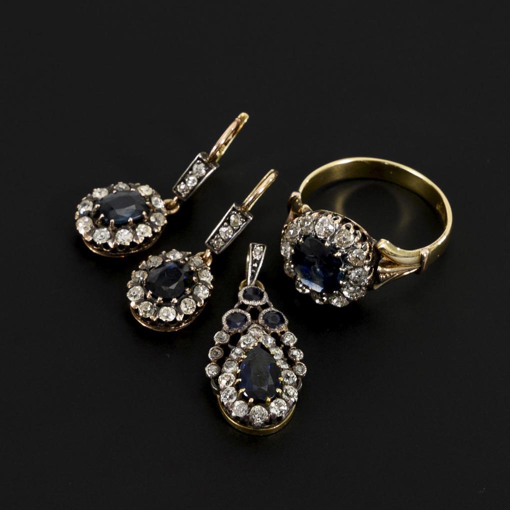 Entourage-Schmuckset mit Saphiren und Altschliff-Diamanten Ende 19. Jh.