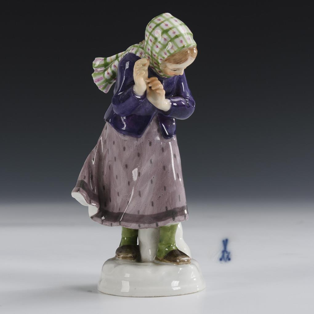 Auf einem Natursockel stehendes, mit den Händen Schneebälle abwehrendes Mädchen. Beschleifung verso am Sockel, Finger der rechten Hand restauriert.