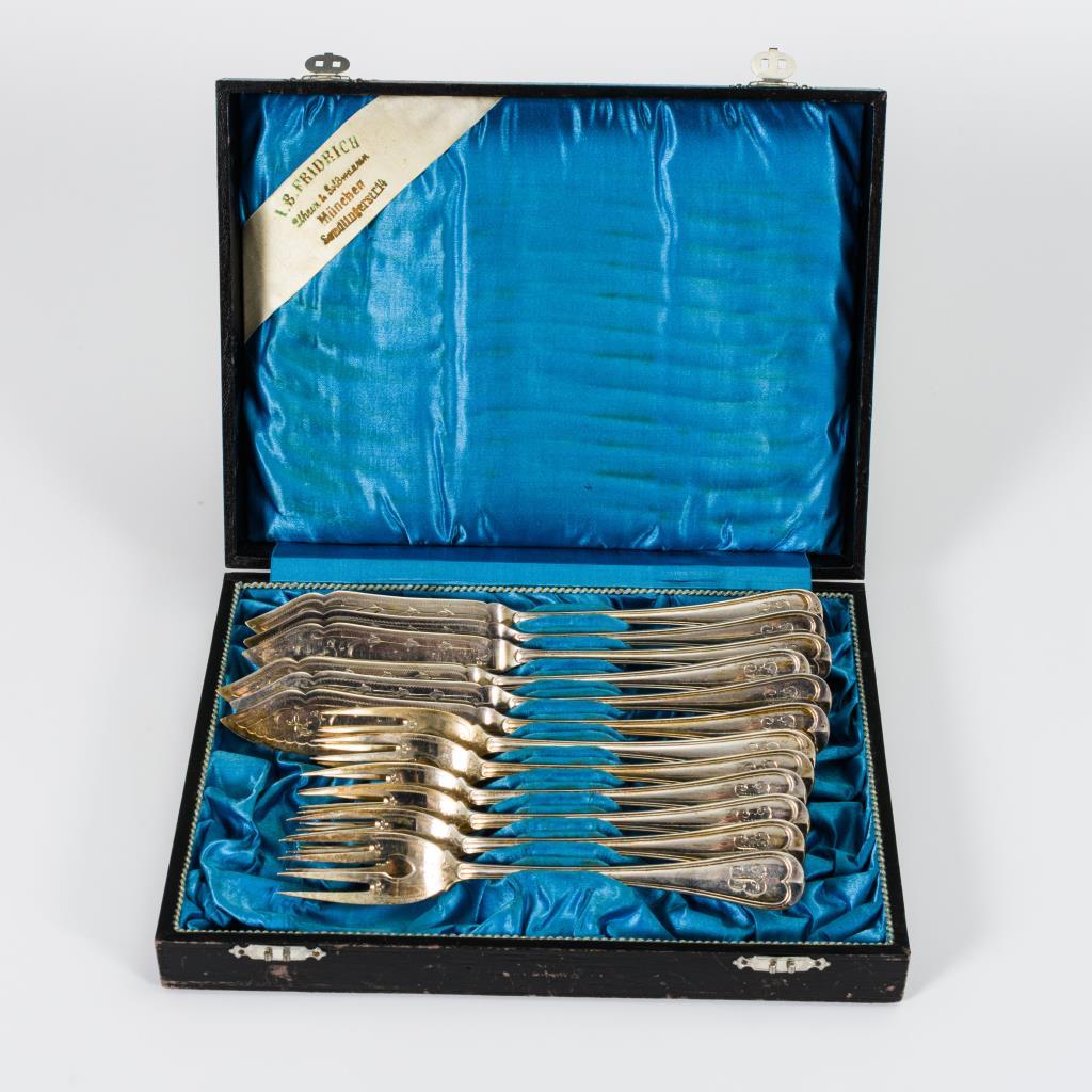 6 Gabeln und 6 Messer. Geschweifte Form mit floralen Gravuren und ligiertem Monogramm "EL". Leichte Alters- und Gebrauchsspuren.