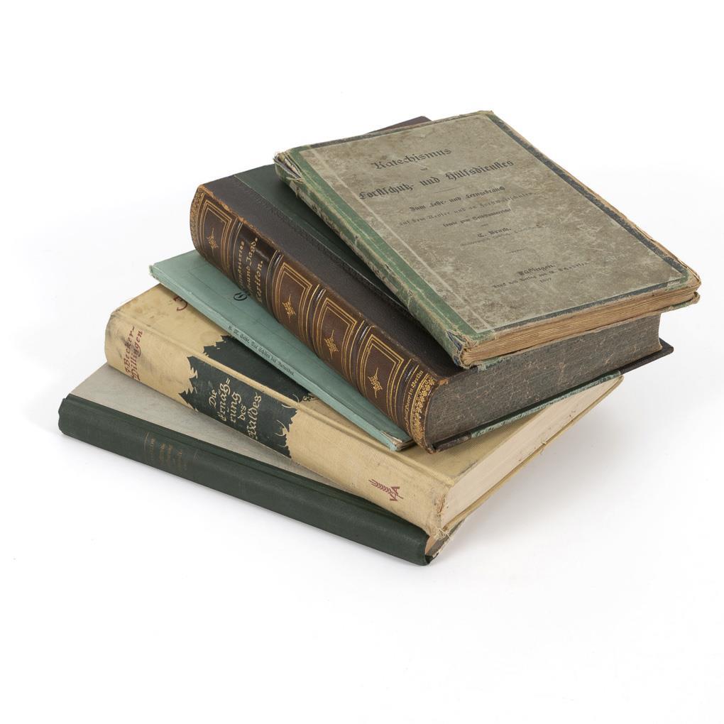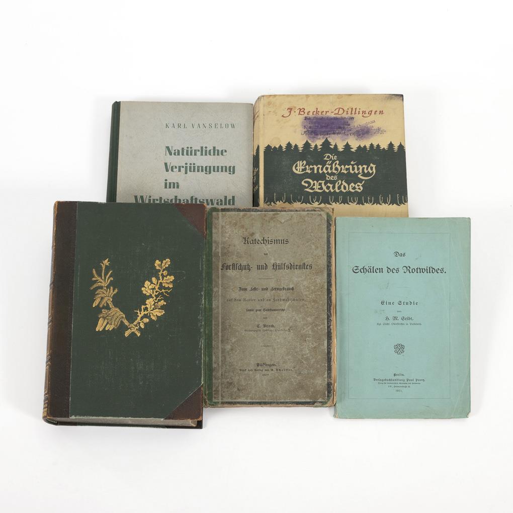 Fürst: "Illustriertes Forst- und Jagdlexikon", Berlin 1888, 827 Seiten. / Seibt: "Das Schälen des Rotwildes", Berlin 1911, 64 Seiten./ Becker-Dillingen: "Die Ernährung des Waldes", Berlin 1939, 589 Seiten. / Vanselow: "Natürliche Verjüngung im Wirtschaftswald", Radebeul 1949, 367 Seiten. / Brock: "Katechismus des Forstschutz- und Hülfsdienstes", Tübingen 1897, 216 Seiten. Alle mit stärkeren Gebrauchsspuren.