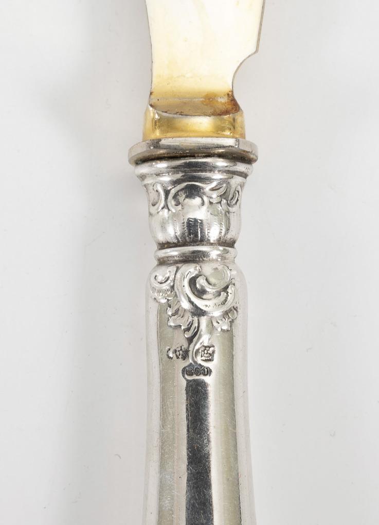 Gefüllte Griffe mit Rocaillereliefs und bekröntem Monogramm "VB" (Familie von Bredow, ehemals Schloss Mückenberg), restvergoldete Stahlklingen und -zinken. Leichte Alters- und Gebrauchsspuren, Gold berieben.