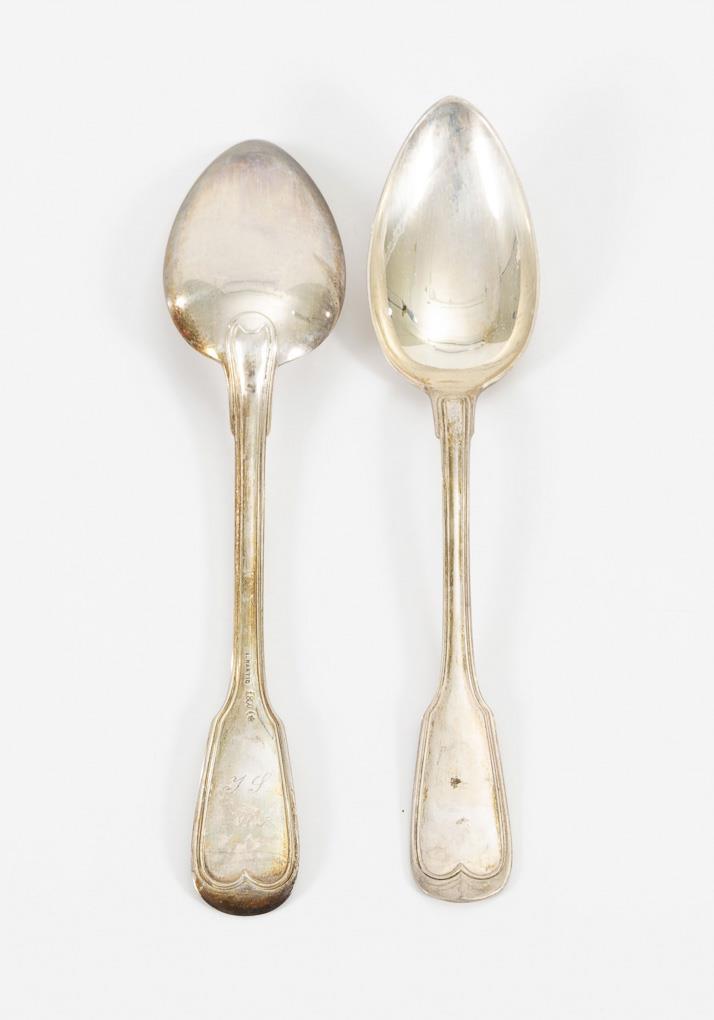 Klassische Form mit Augsburger Faden, meist mit rückseitigen Monogrammgravuren und Datierung. Leichte Altersspuren.
