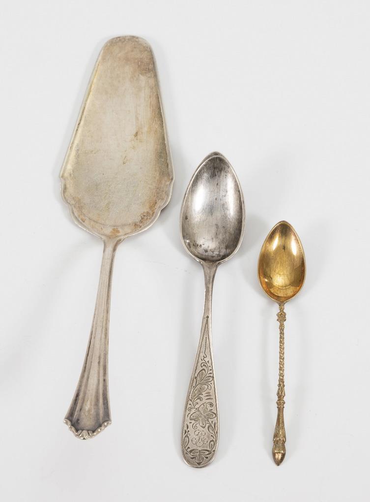 Vergoldete Mokkalöffel mit gedrehtem Stiel, Firmenzeichen Koch & Bergfeld. Tortenheber mit geschweiftem Rand und Blattrelief, Firmenzeichen Bremer Silberwarenfabrik. Kaffeelöffel mit floralen Gravuren, Firmenzeichen Hermann Walter. Leichte Alters- und Gebrauchsspuren.