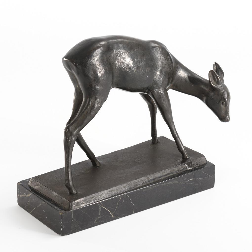 Realistisch gestaltetes Reh beim Äsen. Kleinere Chips an der Plinthe.