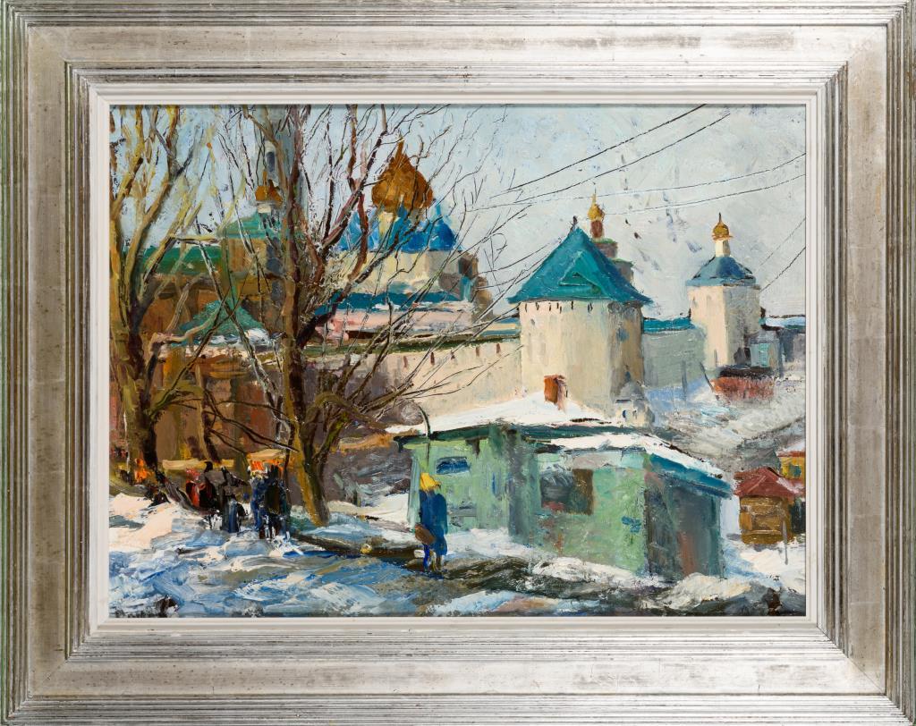 Pastos gemalte winterliche Stadtansicht mit Staffagefigur an einem hellen Tag.