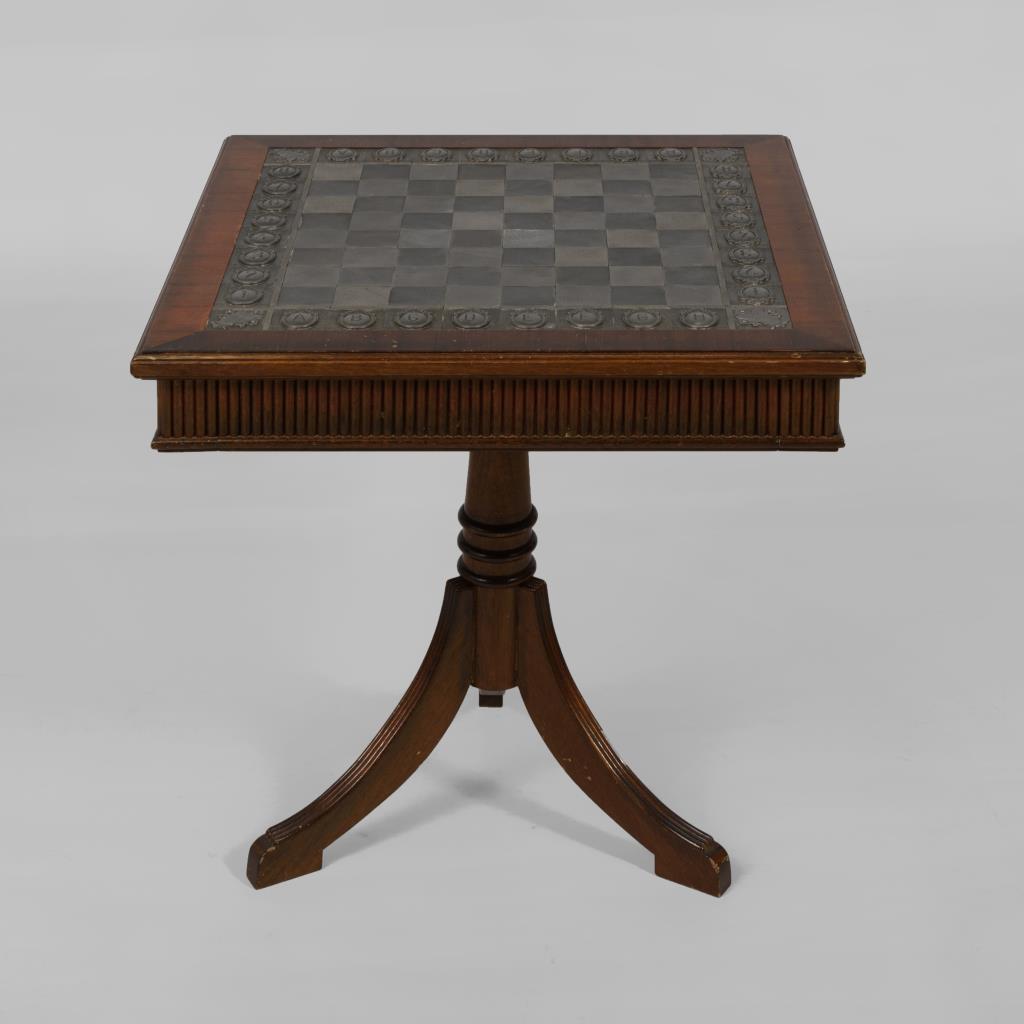 Kleiner Schachtisch mit Mittelstütze und Säbelbeinen, quadratische Tischplatte mit kannelierter Zarge und 2 Zargenschüben zur Aufbewahrung der Figuren, Platte mit Schachbrett aus Zinn im neogotischen Stil, gemarkt "H.K." (Hartmut Krukemeyer). Alters-/Gebrauchsspuren, Furnier mit kleinen Defekten.