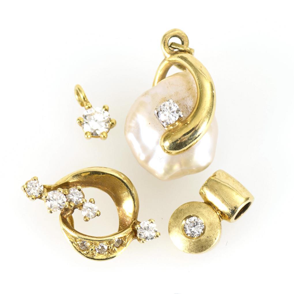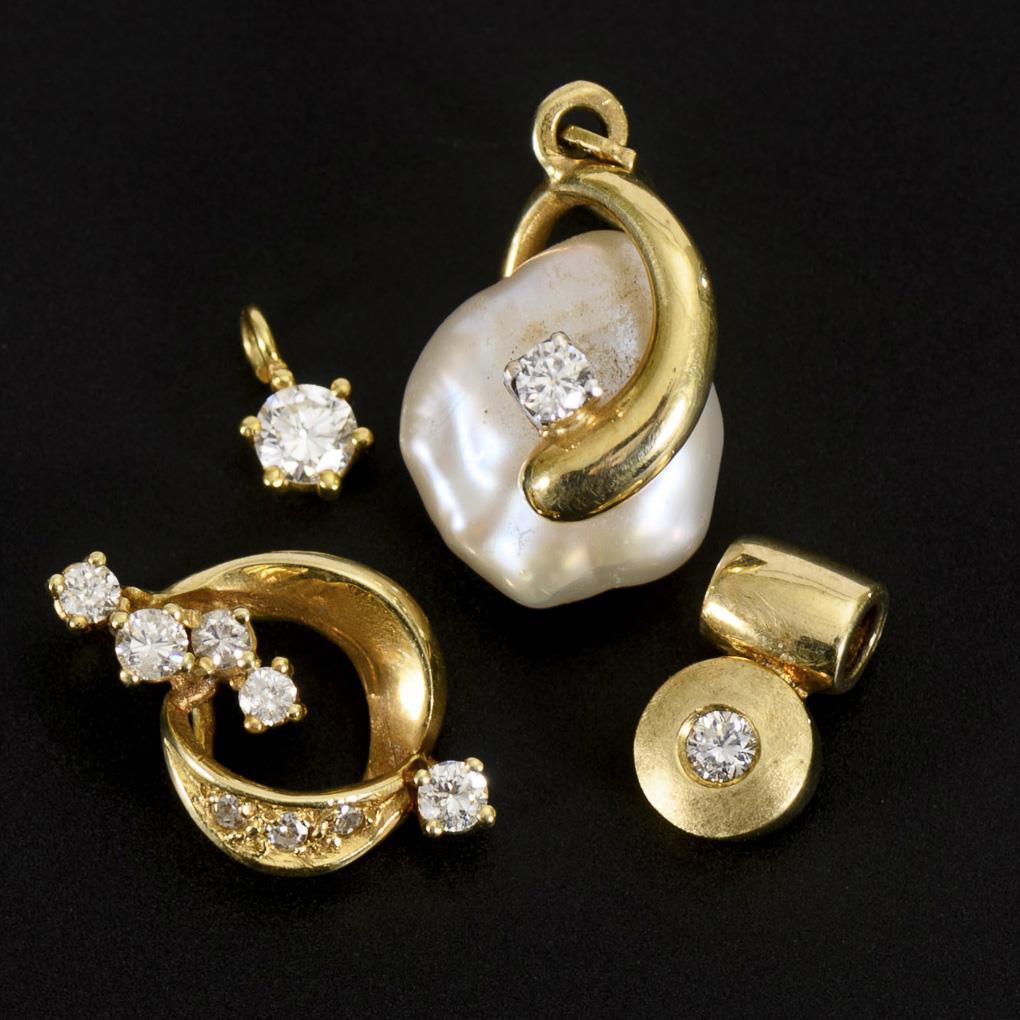 1 Anhänger mit gefasster Zuchtperle (Barock) und kleinem Brillant. 3 verschiedene Anhänger mit kleinen Brillanten.