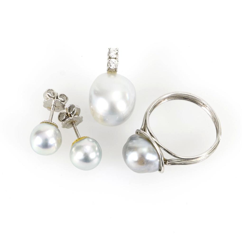 Anhänger mit Barockperle und 2 chatongefassten Brillanten. Ring und Ohrsteckerpaar mit Barockperlen. Mittlere Schiene, Steckmechanik.