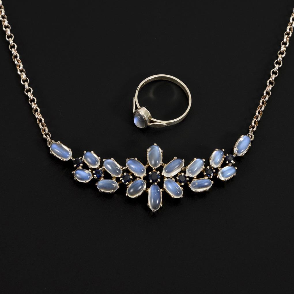 Schauteil mit krappengefassten Cabochons und Saphiren, zwischen Erbskette, an Ringfederschließe.