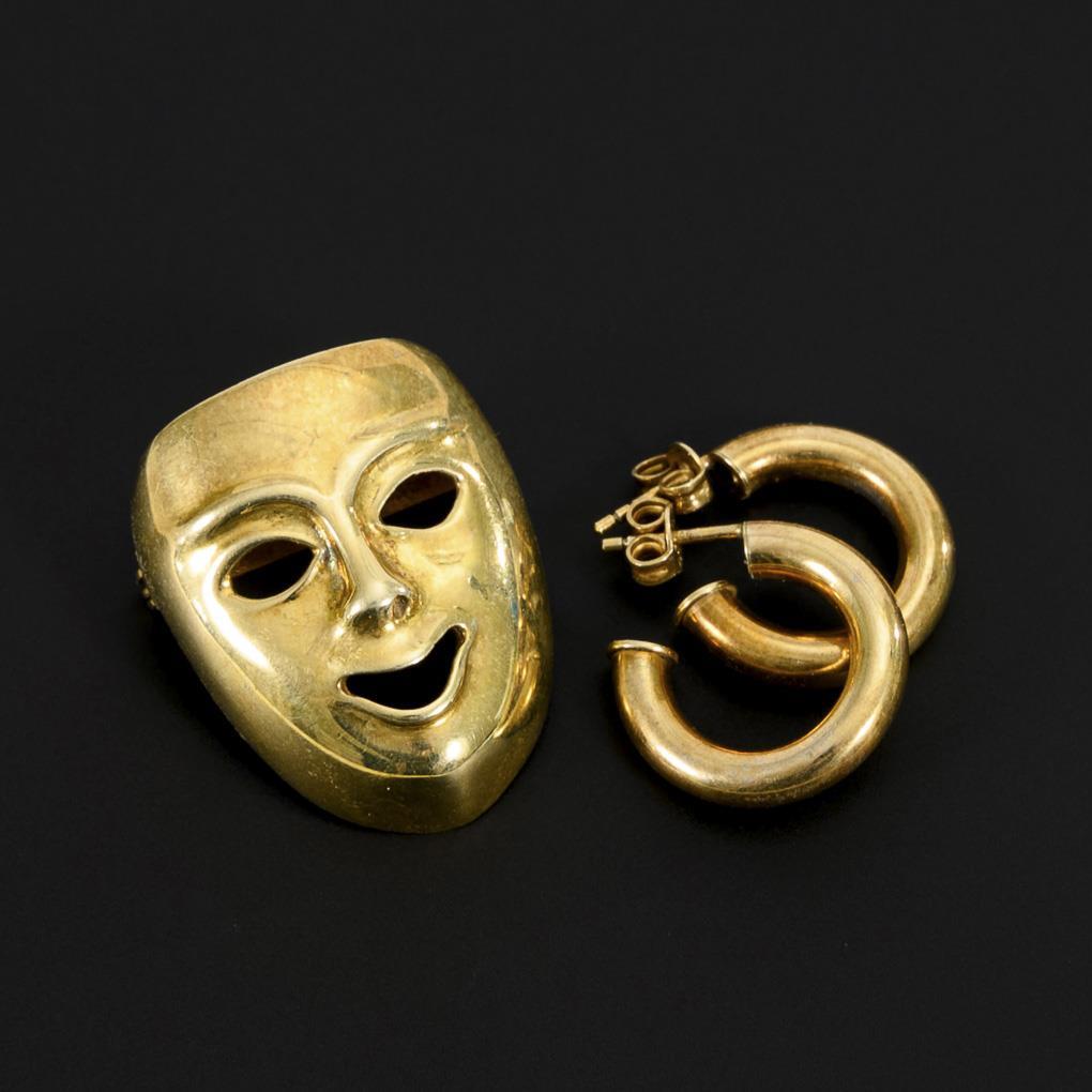 Lachende Maskenbrosche und Creolenpaar. Kugelhaken, Steckmechanik.