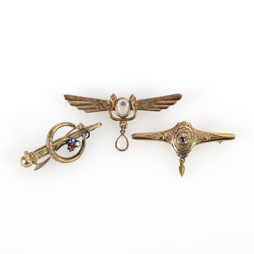 3 reliefierte Broschen mit Mondsteincabochons, Halbperlchen und Saphir. Kugelhaken und C-Haken.