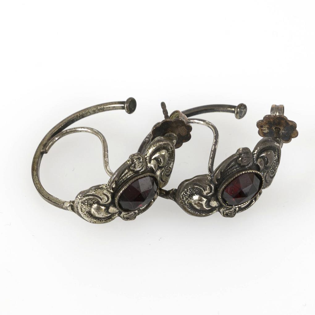 Creolen mit zargengefassten Granaten und reliefiertem Rahmen, zwischen großem Reif. Ergänzte Steckmechanik.