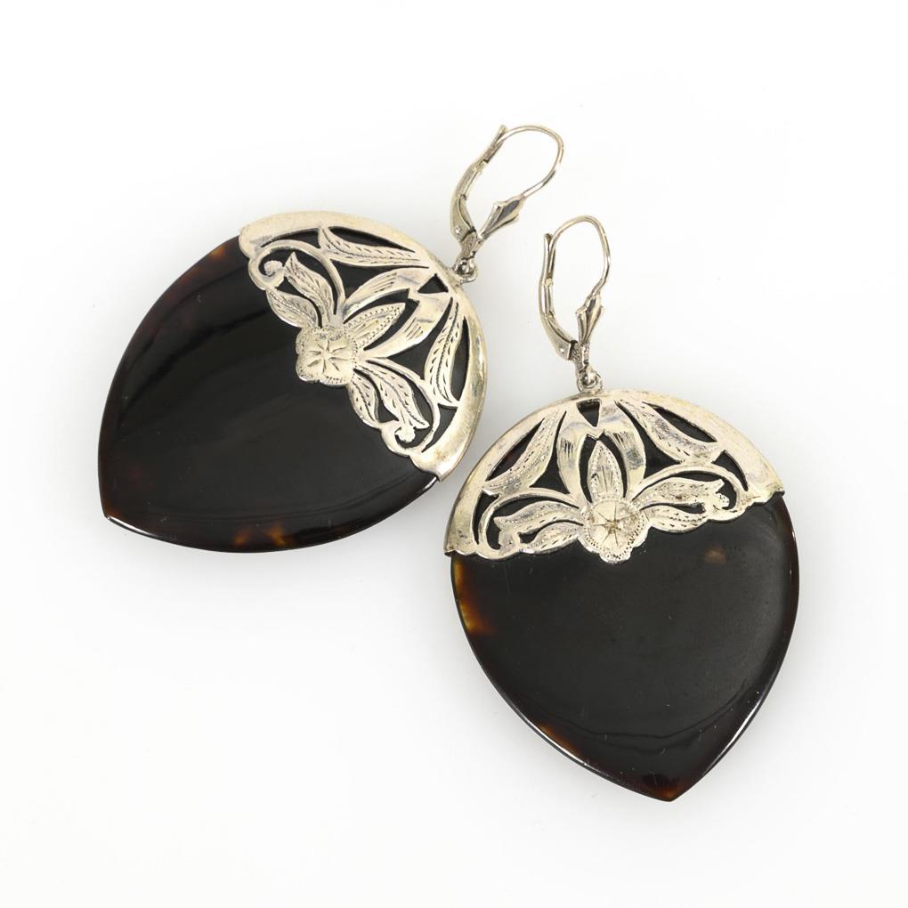 Durchbrochene Silbermontierung mit dunkelbrauner Horneinlage. Federbügel.