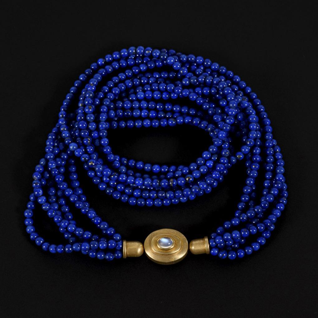 Schnürketten mit kleinen Lapiskugeln, an Zierschließe mit Mondsteincabochon.