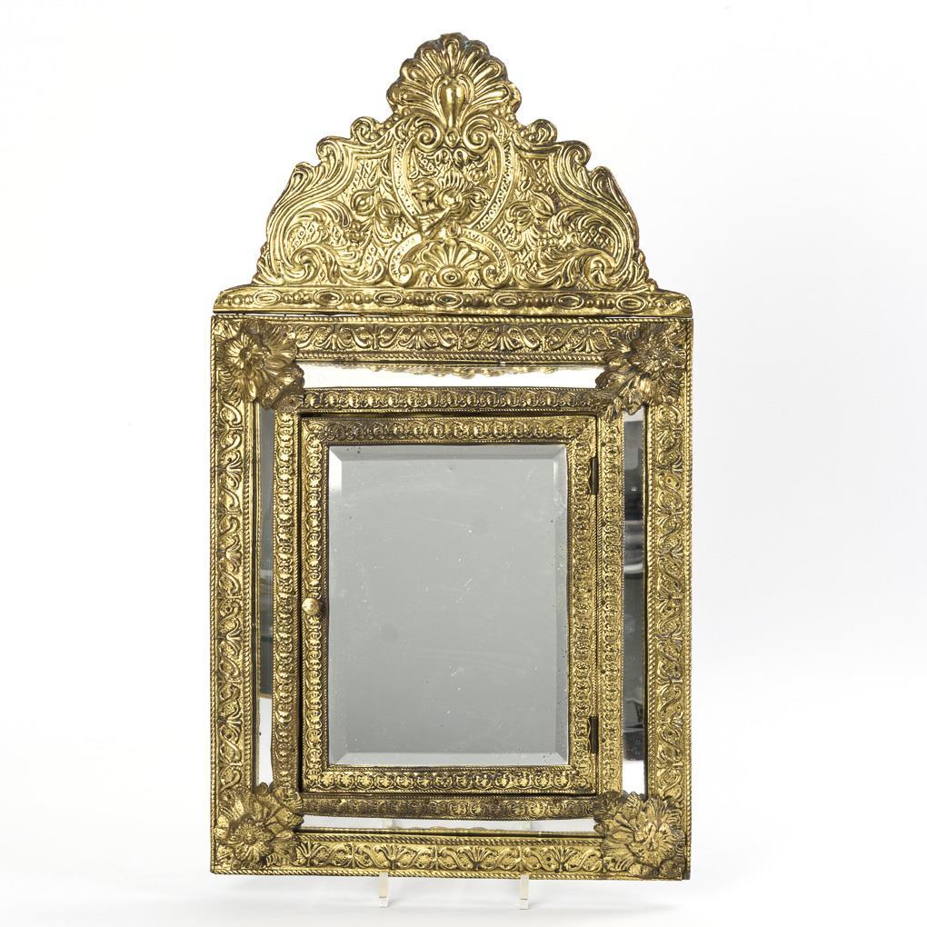 In der Art eines venezianischen Spiegels gestaltetes Schränkchen mit facettiertem Spiegelglas in der Fronttür, flankierenden Spiegelstreifen sowie ornamental geprägtes Blech mit Bekrönung. Innen 2 Bürsten mit geprägten Blechrücken vor ebensolchem Hintergrund. Minimale Alters-/Gebrauchsspuren.