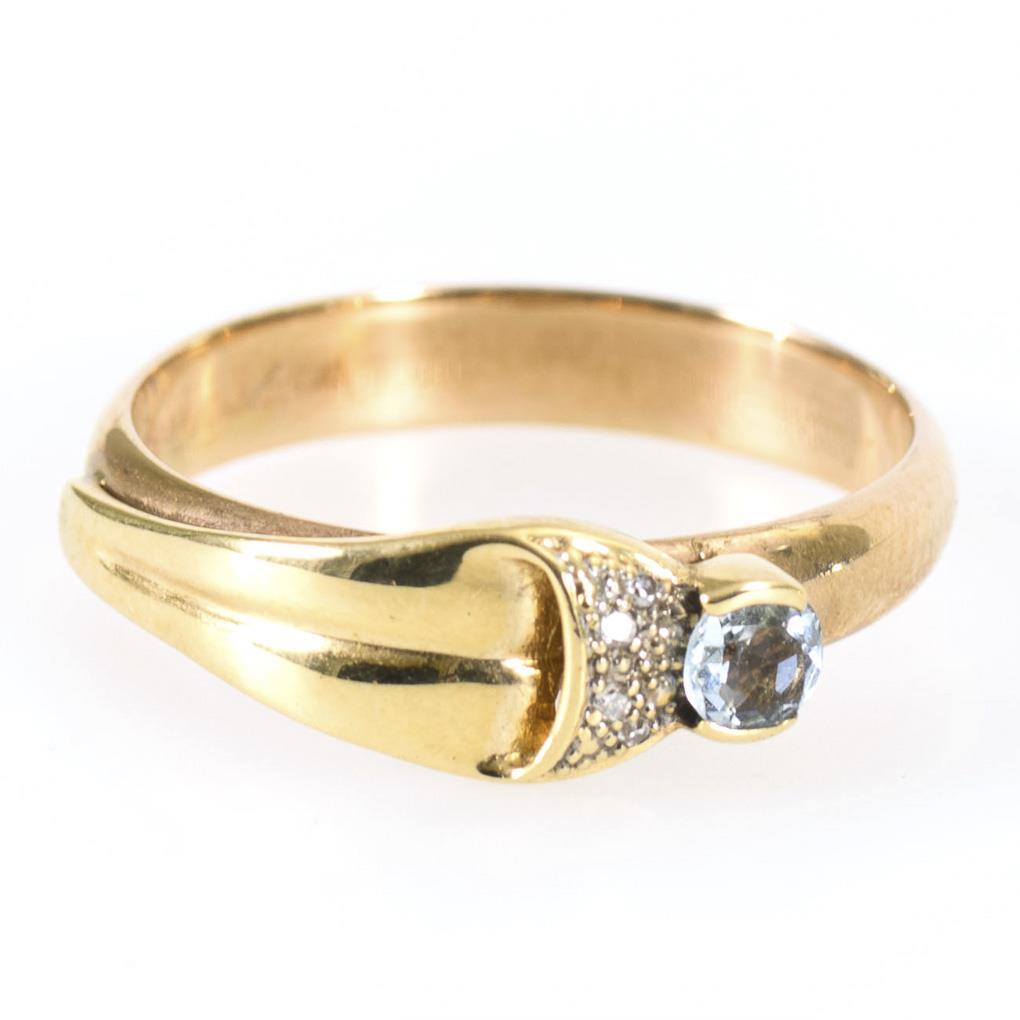 Gefasster Aquamarin und 4 kleine, eingelassene Diamanten, auf mittlerer Schiene.