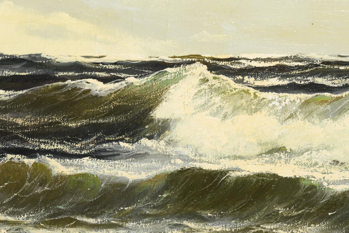 Hohe Wellen nahe dem Strand an einem sonnigen Tag. Minimale Altersspuren.