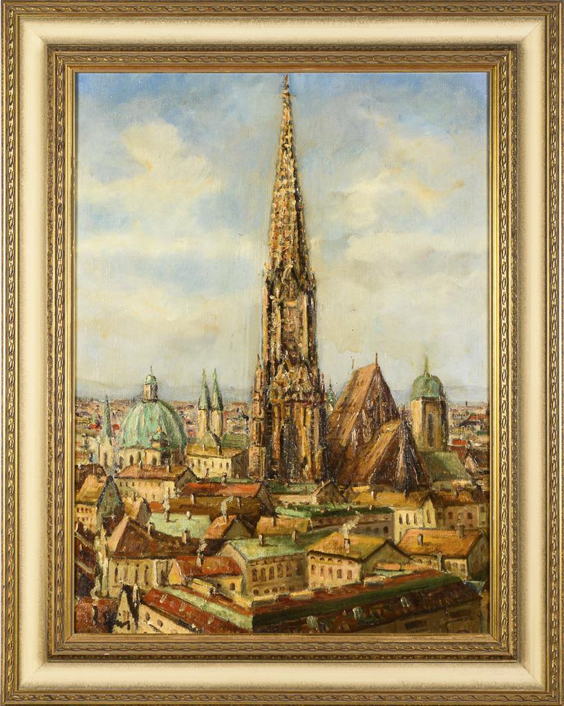 Blick über die Dächer der österreichischen Stadt mit dem Dom im Mittelpunkt und im warmen Sonnenlicht.