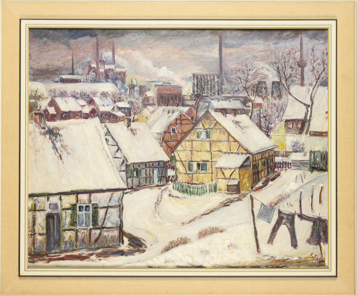 Undeutlich signiert: Stadt mit Industrieanlage im Winter