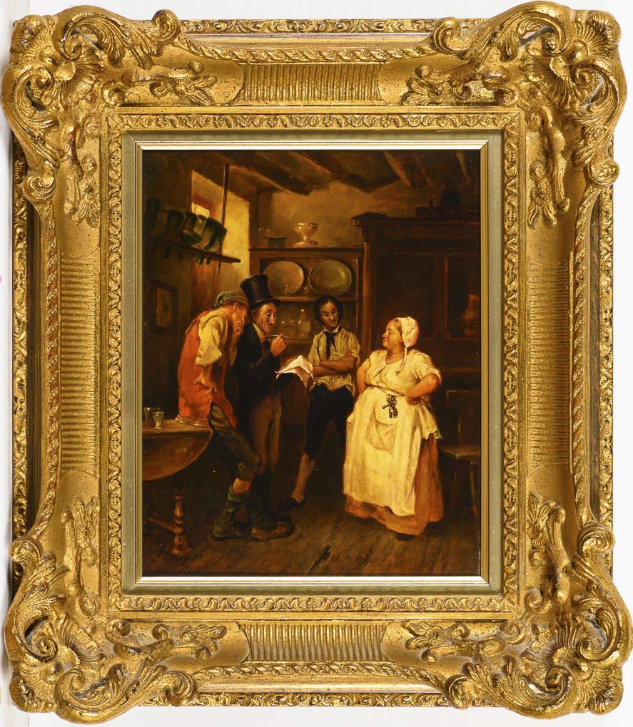 Familie in der Stube beim gemeinsamen Verfassen eines Briefes.