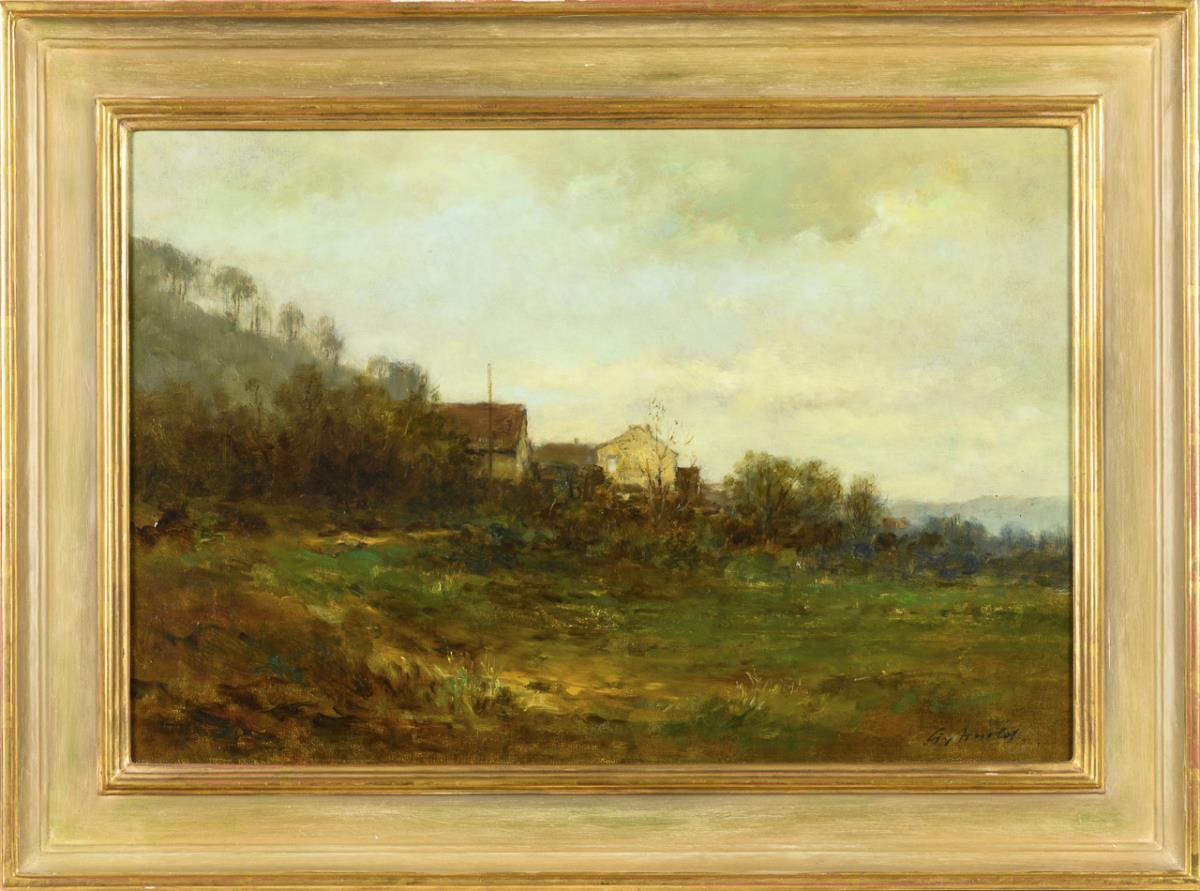 Dorfhäuser am Waldrand unter wolkigem Himmel.