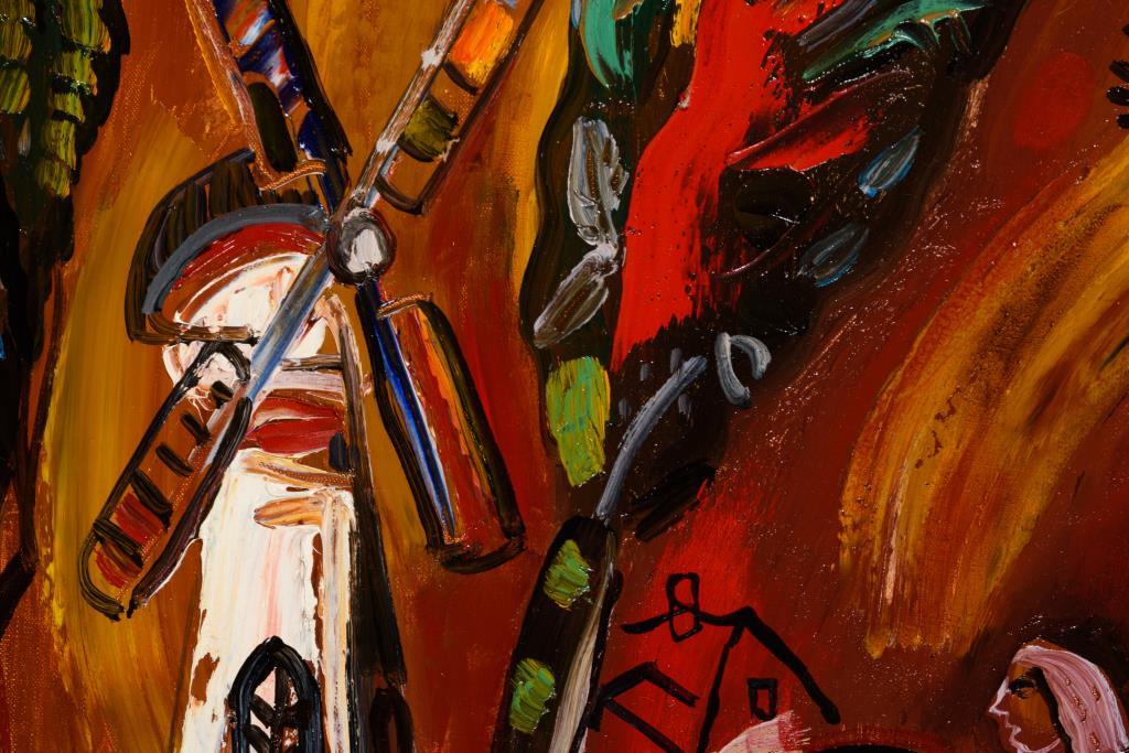 Abstrakte Landschaft mit Tieren, Menschen und Windmühle.