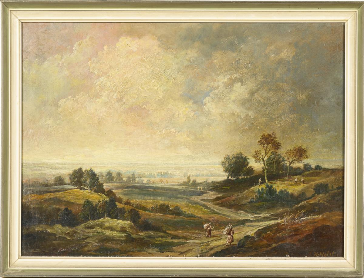 Staffagefiguren auf einem Weg in hügeliger Landschaft unter weitem wolkigem Himmel.