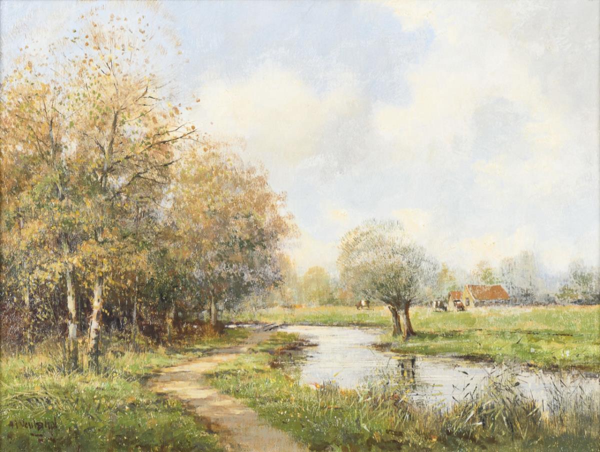 Flusslauf mit angrenzendem Waldstück nahe einem Hof mit Rindern auf der Weide.