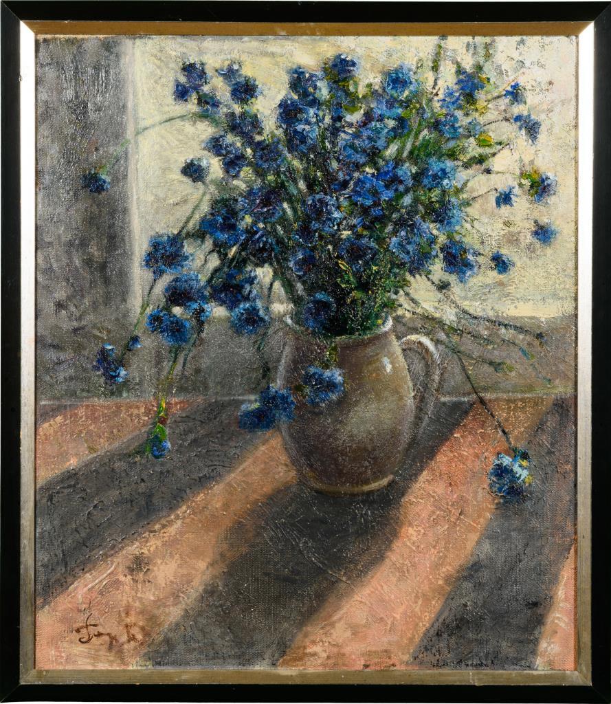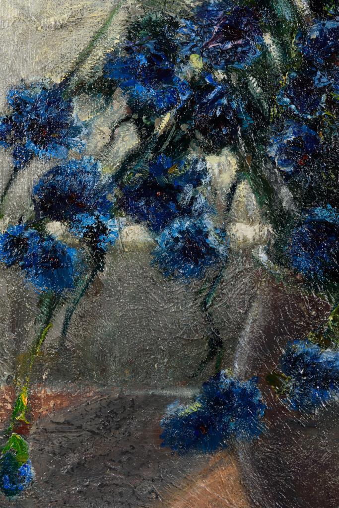 Pastos gemalte Blumen in einer Kanne vor dem Fenster.