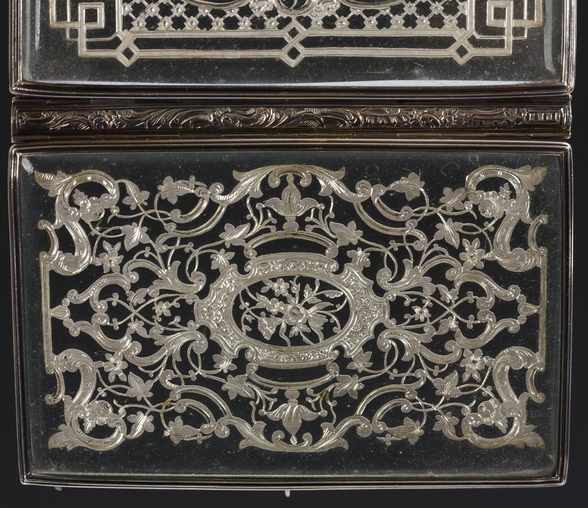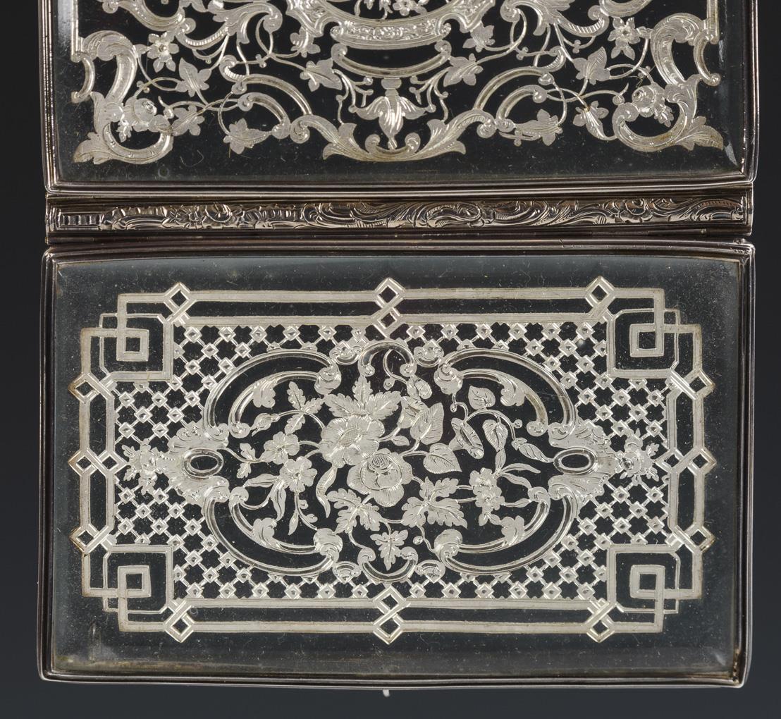 Äußerst fein gearbeitetes Notizblock-Etui mit Zwischensilber; dazu ein Silberstift.