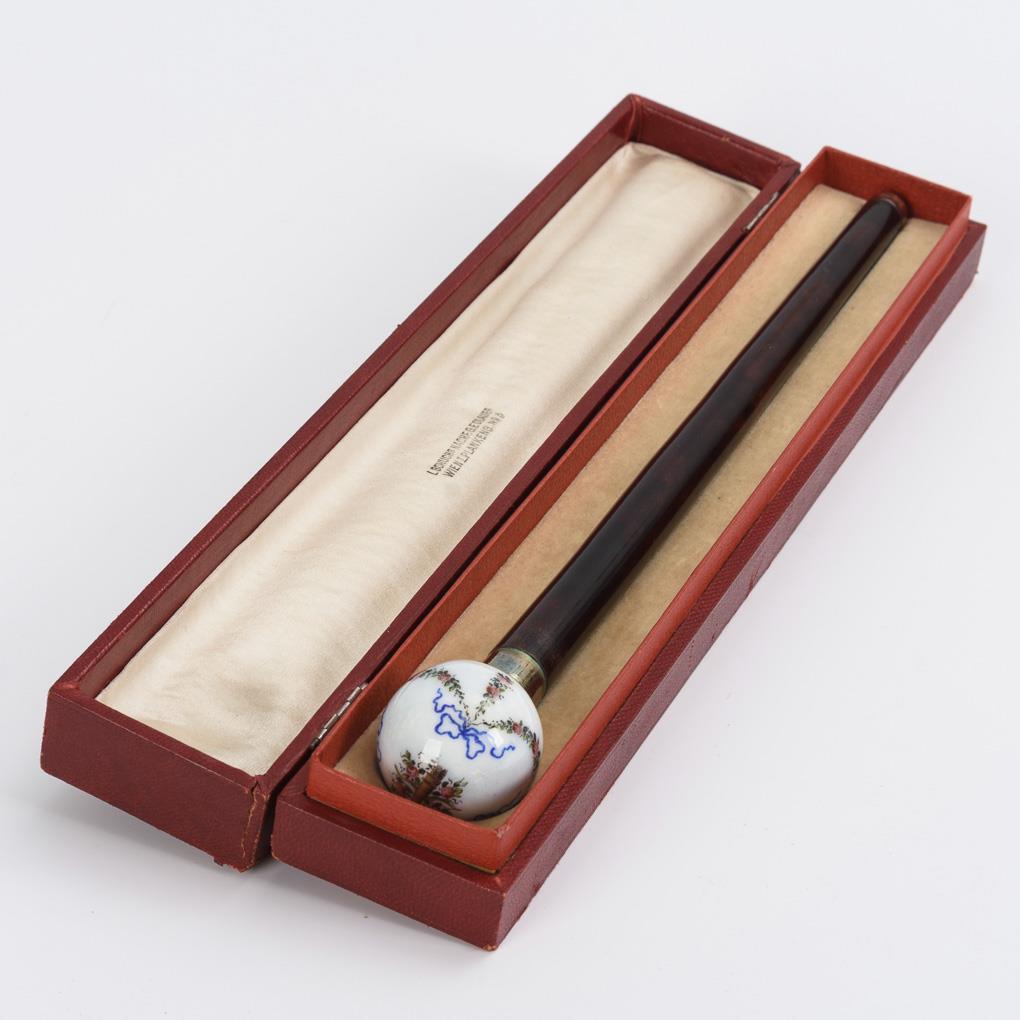 Kugelknauf mit fein gemalter Rosengirlande sowie Pfeil und Köcher Amors. Dunkelrot lackierter Schaftansatz mit Manschetten. 1 geringer Kratzer am Lack, Etui etwas bestoßen.