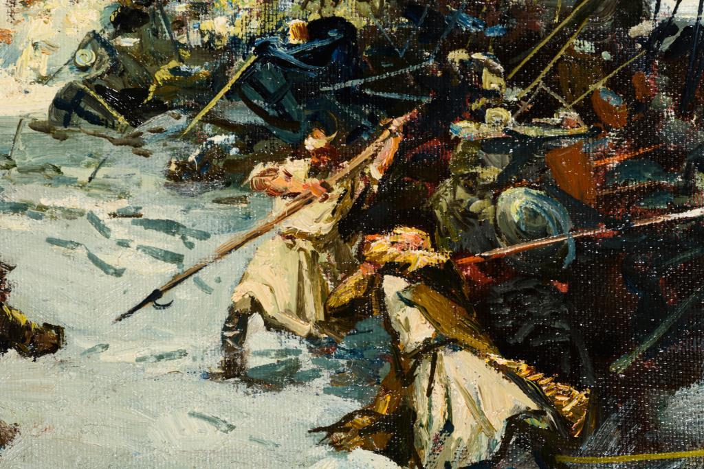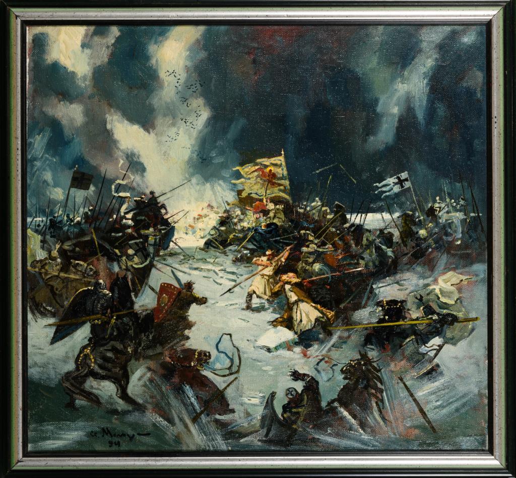 Wildes Schlachtgetümmel zweier aufeinander prallender Heere unter stürmischem Himmel.