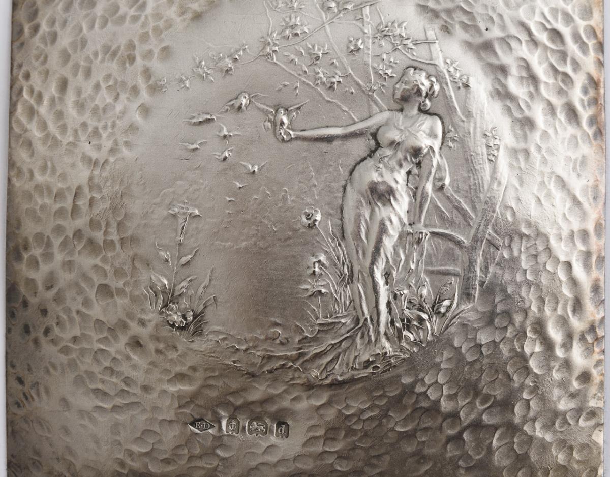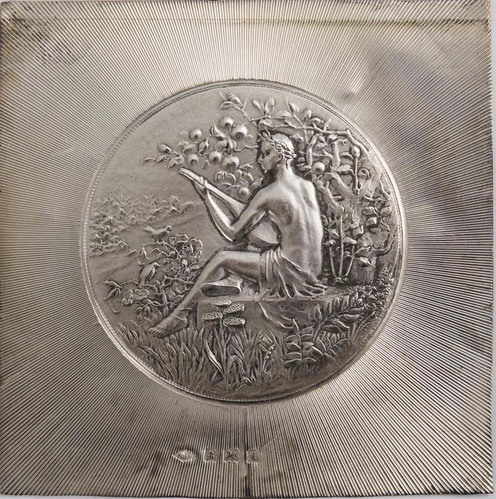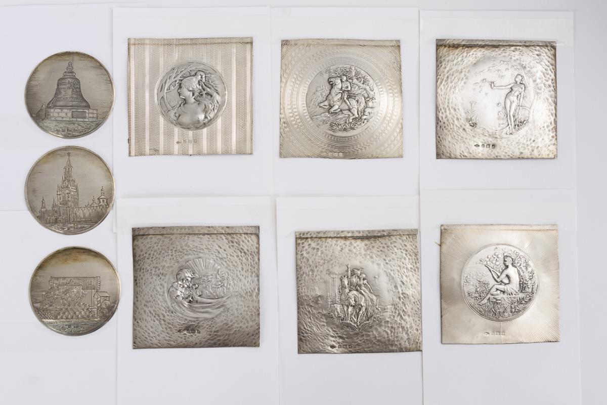 3 leicht gewölbte russische Relief-Medaillons: Die Zarenglocke im Moskauer Kreml, die Zarenkanone ebd. sowie die Basilius-Kathedrale in Moskau. / Quadrat-Plaketten mit guillochiertem bzw. martelliertem Hintergrund und zentralem Relief-Medaillon: Ritter auf steigendem Pferd, reitender Falkner und Dame beim Kuss (Entwerfer-Monogramm DT), Frau mit Taube in der Hand, Lautenspieler, Bild einer Frau mit entblößter Brust sowie Kind mit Pusteblume. Rückseitig je entfernte Montierstifte, einige Platten gering gewellt, je mit Klebeband auf Karton geklebt.
