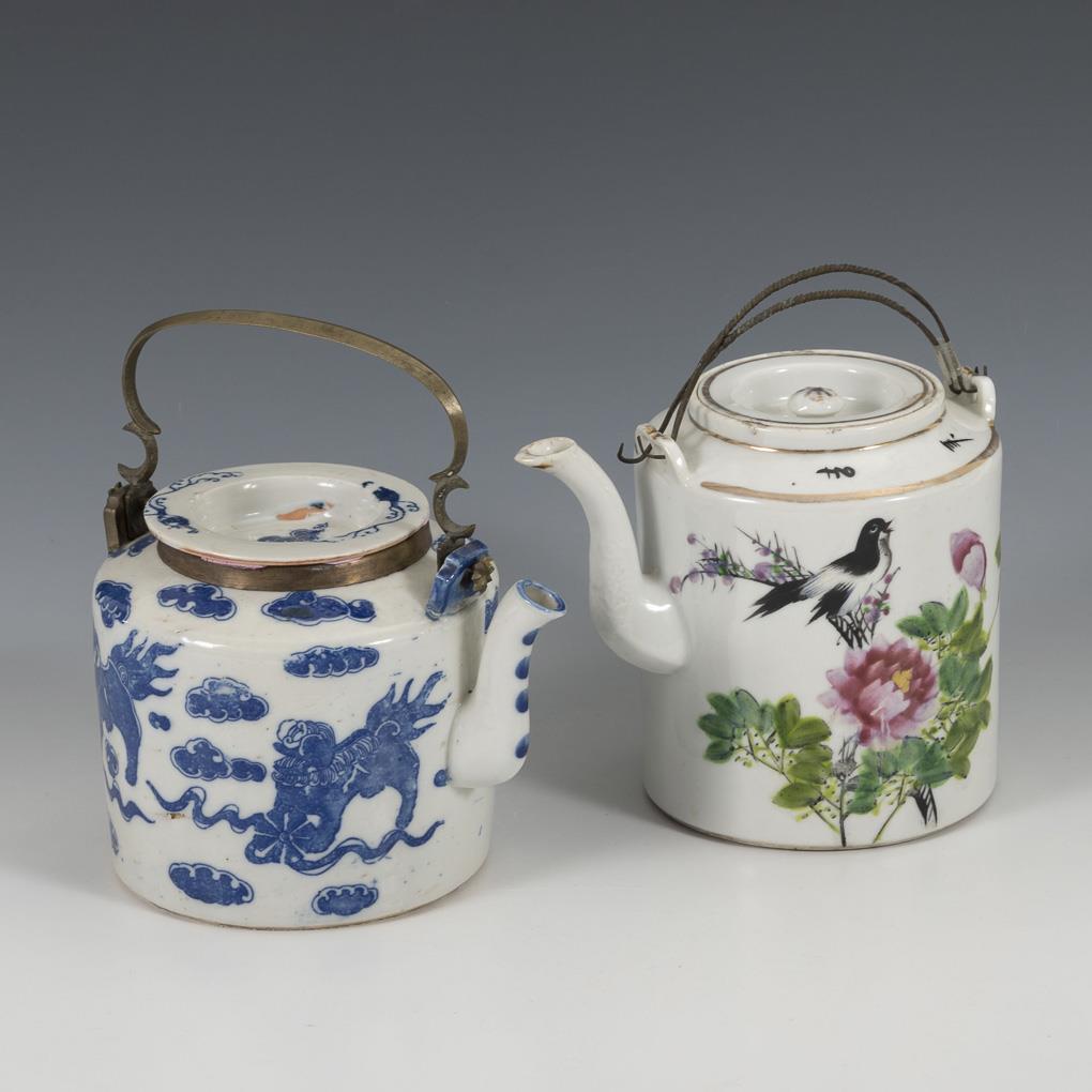 Kanne mit Unterglasurblaudekor, Qilin zwischen Wolken. Messingmontierung um oberen Rand und als Henkel. Kleiner Brandriß in der Schulter. / Kanne mit polychromer Bemalung, Elster auf Päonienblüte, auf Rückseite und Schulter Schriftzeichen. Zwei gedrehte Metallhenkel und Ansatz der Tülle mit Unterglasurrelief, Goldrand etwas berieben.