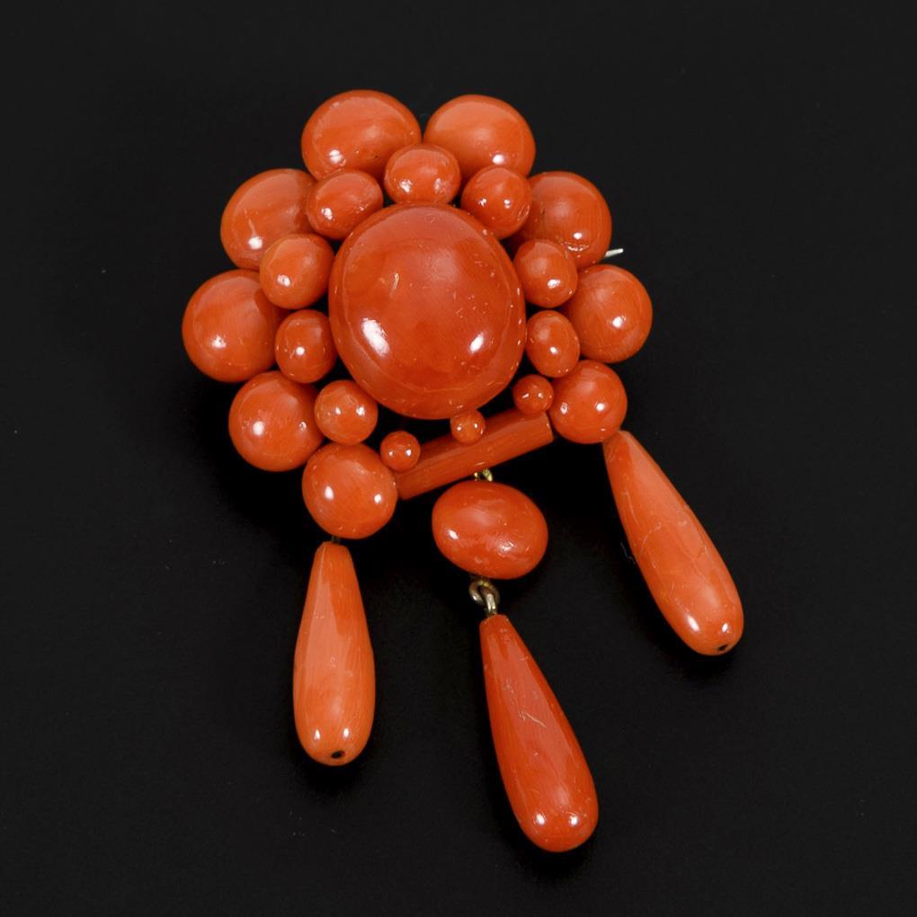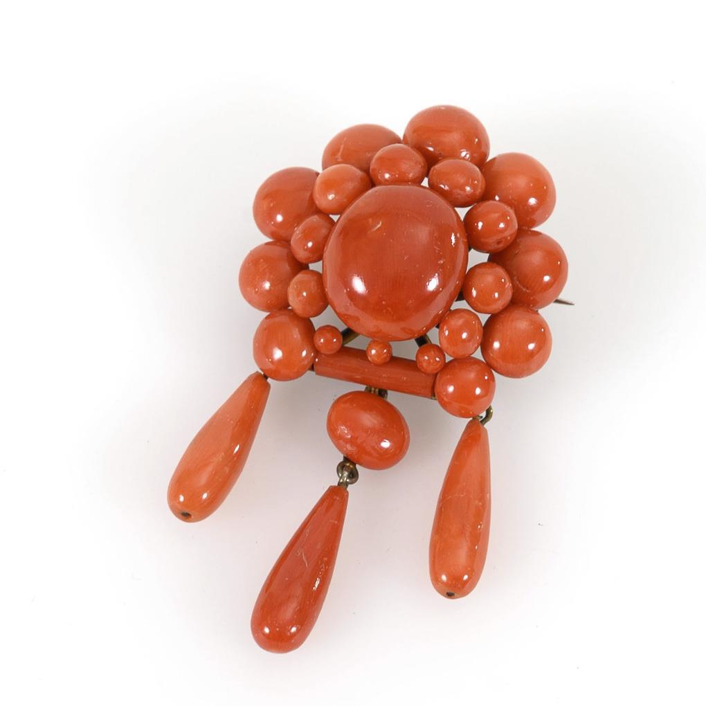 Blütenbrosche mit Korallenlinsen und Tropfenabhängungen. Metallbroschierung.