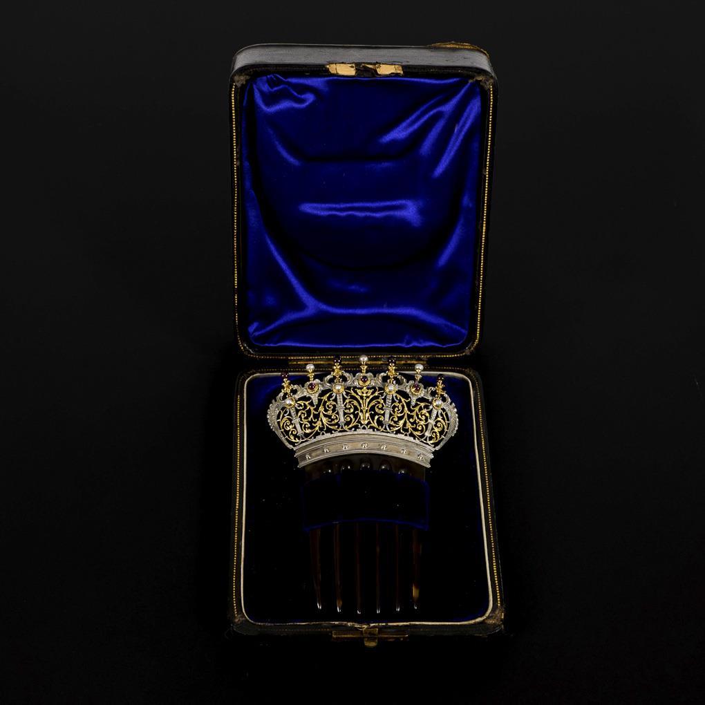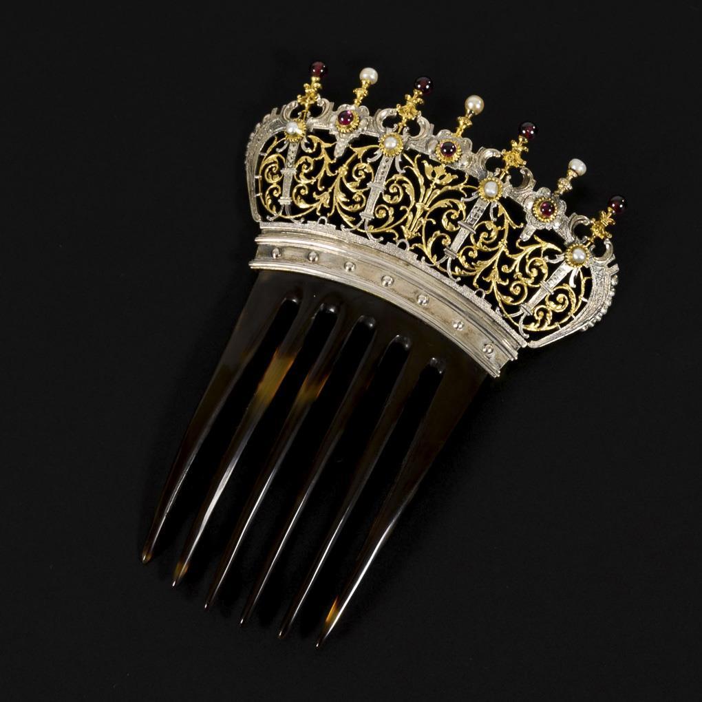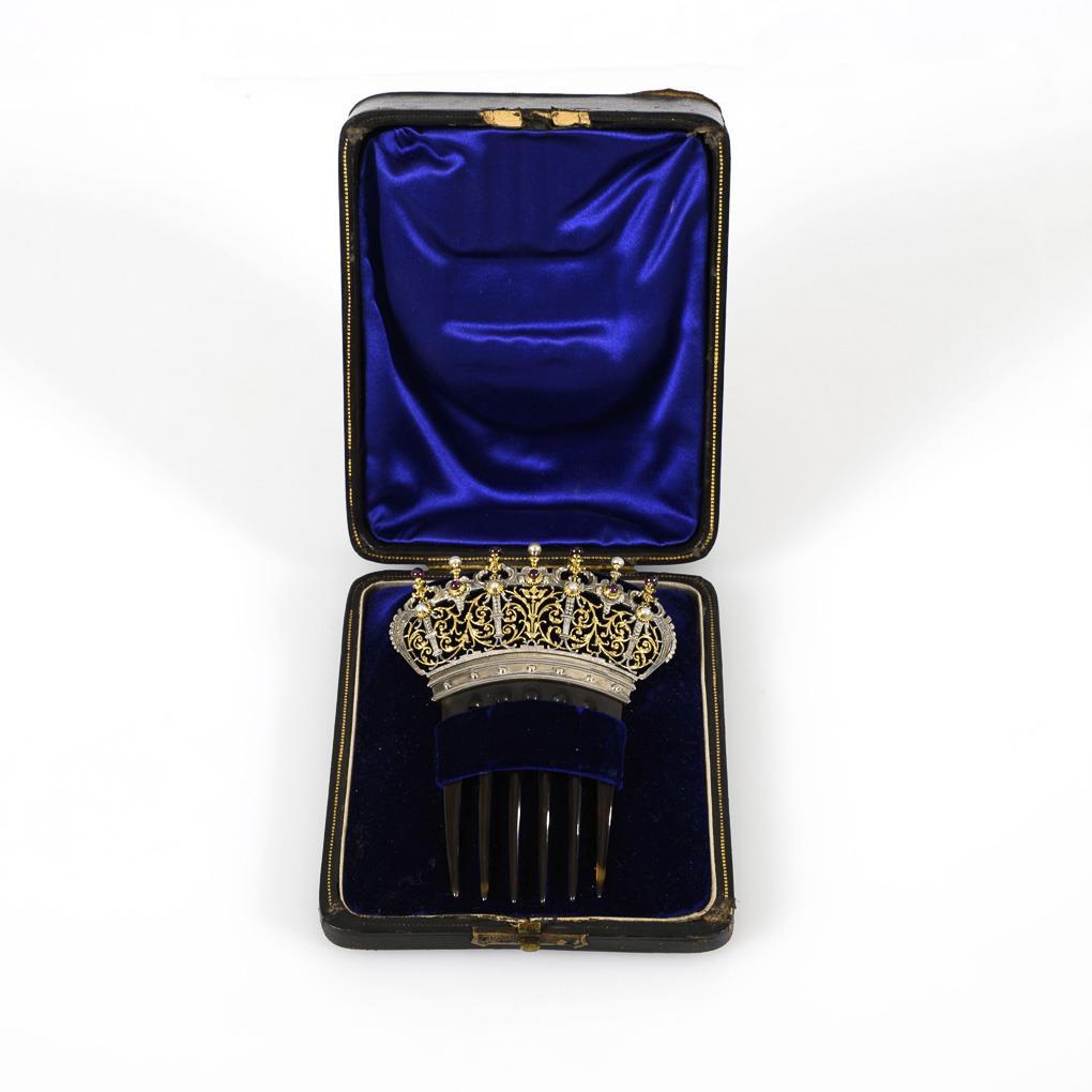 Großer Kamm mit rankenverzierter, kronenartiger Montierung, besetzt mit Perlchen und Granaten. In schwarzem Etui mit silberner, gravierter Monogramm-Montierung H v R.