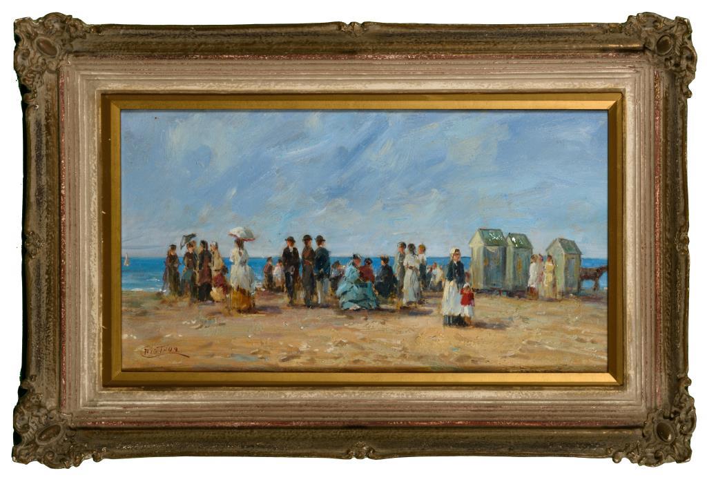 Viele Menschen in der Mode um 1900 bei hellem Sonnenschein am Strand.