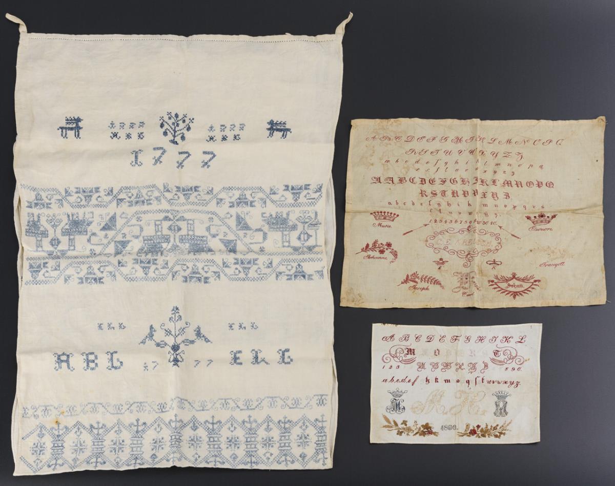 Barocker Leinen-Vorhang mit blauen Kreuzstichmotiven, Monogrammen und Datum "1777" sowie gehäkelte Borte. / Stickmustertücher mit dem Alphabet in Antiqua und Fraktur und Zahlen. Großes Biedermeier-Stickmustertuch "C. E. Kreusch" mit Vornamen/Monogrammen unter Symbolen. Kleines Mustertuch mit mehrfarbiger Stickerei, darunter Monogramme "MH" und Datum "1890". Je fleckig/vergilbt, kleines Mustertuch kaum.