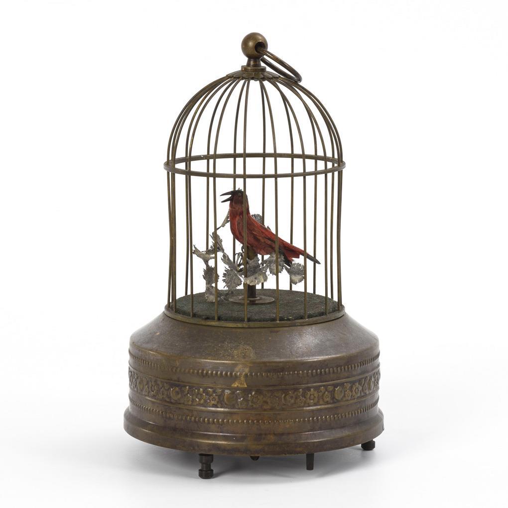 Runder Käfig mit floralem Relieffries am Sockel. Innen roter Vogel auf einem Zweig, der zwitschert und dabei Schwanz, Kopf und Schnabel bewegt. Funktioniert. Etwas verschmutzt.