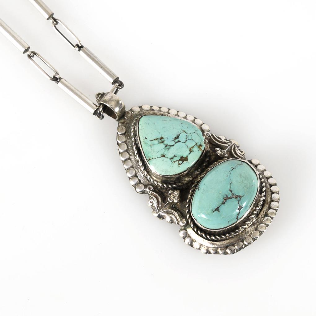Zargengefasste Türkiscabochons in reliefiertem Rahmen, an Stabgliederkette mit S-Haken.
