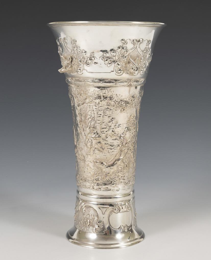 Großer silberner Jagdpokal in Form eines Kluftbechers.