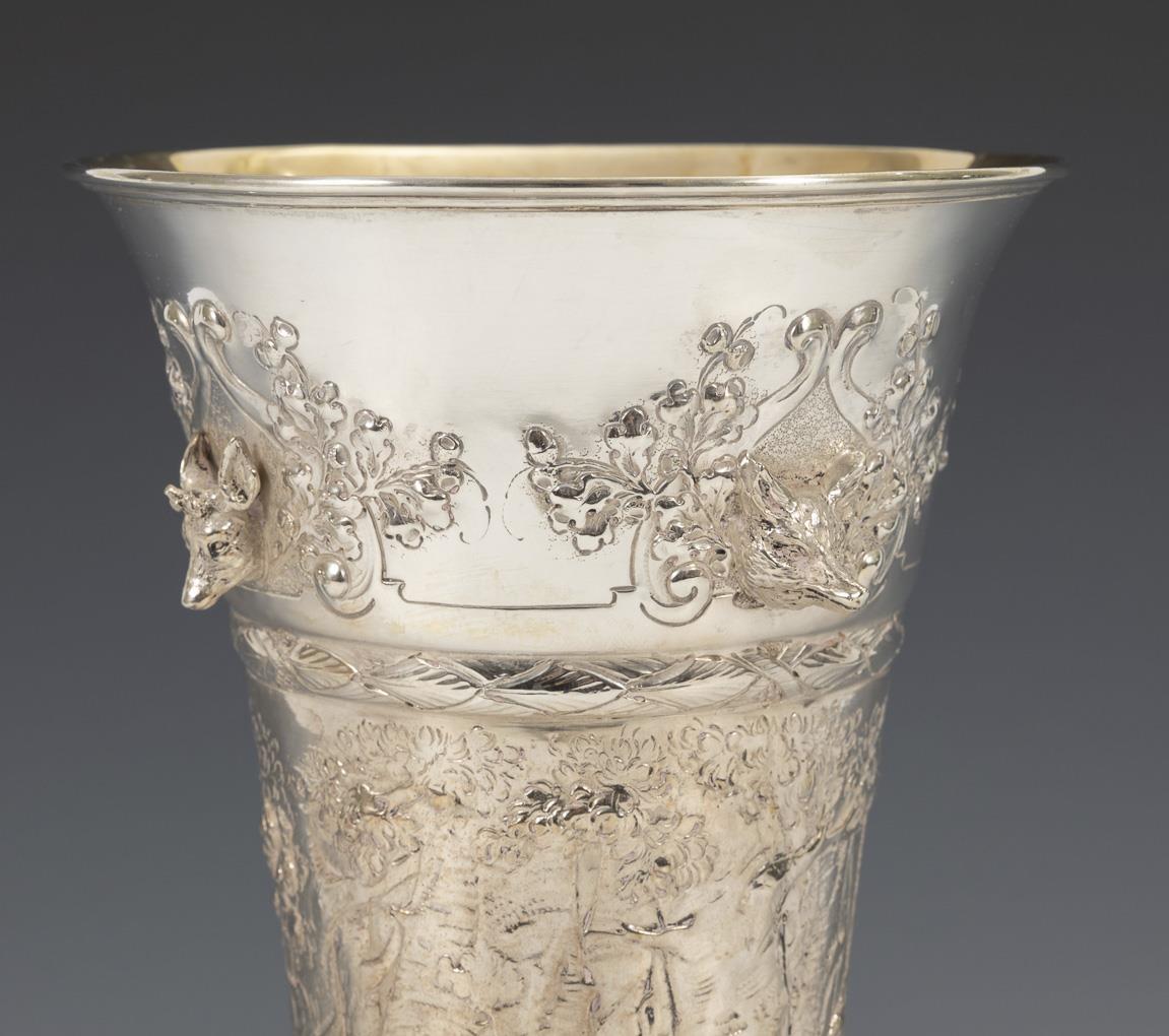 Kunstvoll gestalteter, konischer Becher mit historistischem Reliefdekor und teilplastischen Tierköpfen, umlaufend eine reliefierte Jagdszene mit Jägern, Hunden und einem Hirsch.